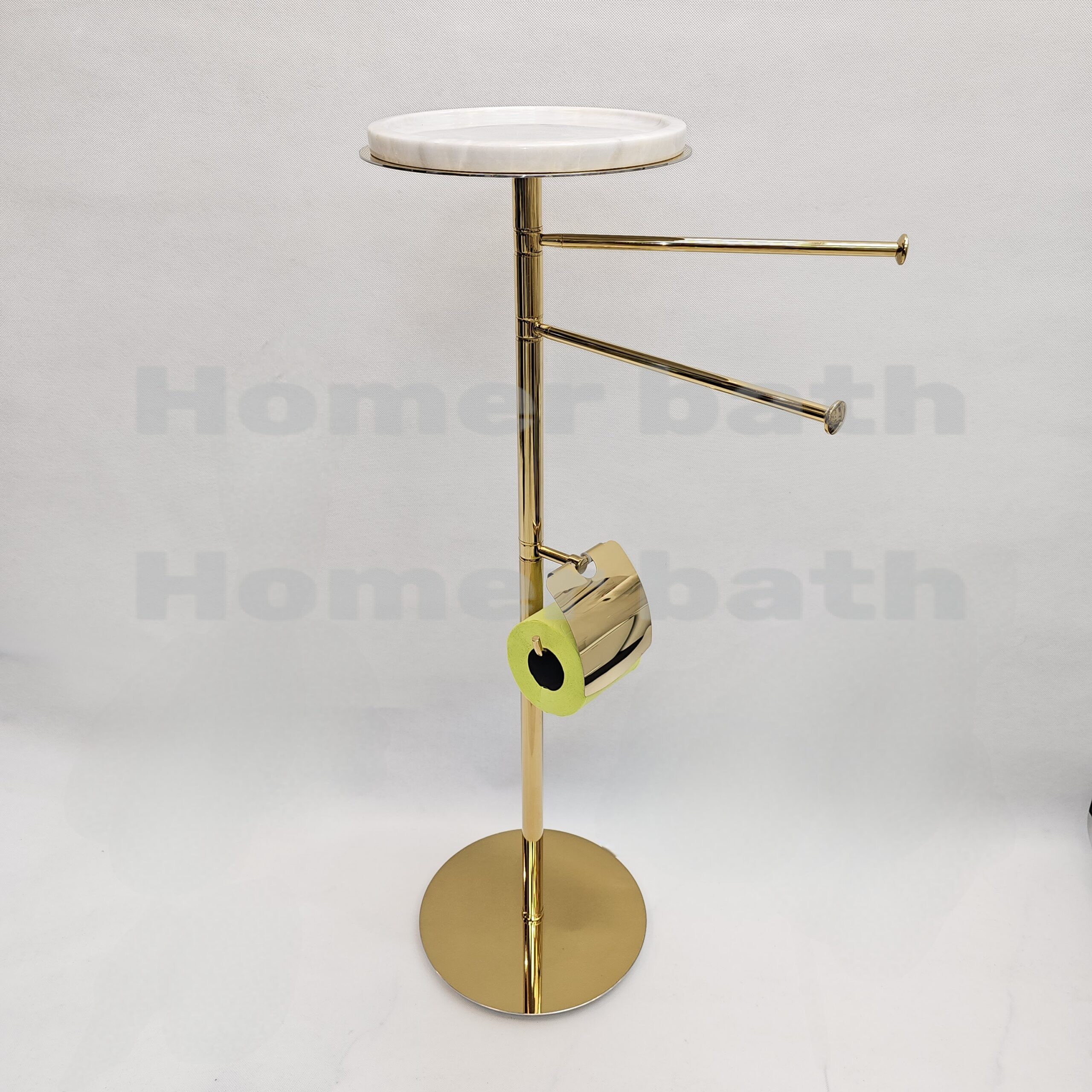 استند طلایی با داشتم جای دستمال و دو جای حوله به همراه یک سینی سفید با قابلیت چرخش